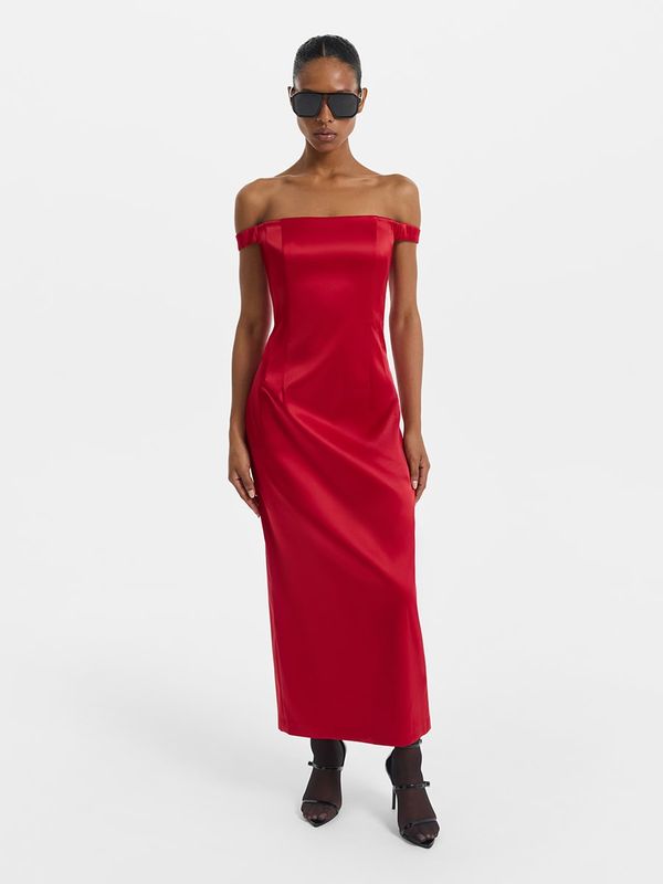 Сатиновое платье-футляр с открытыми плечами
