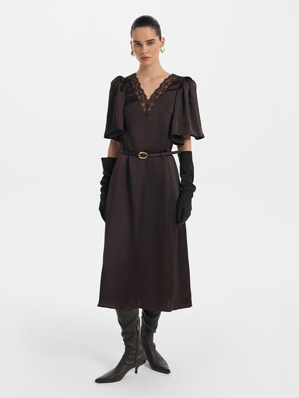 Атласное платье миди с кружевом и ремнем