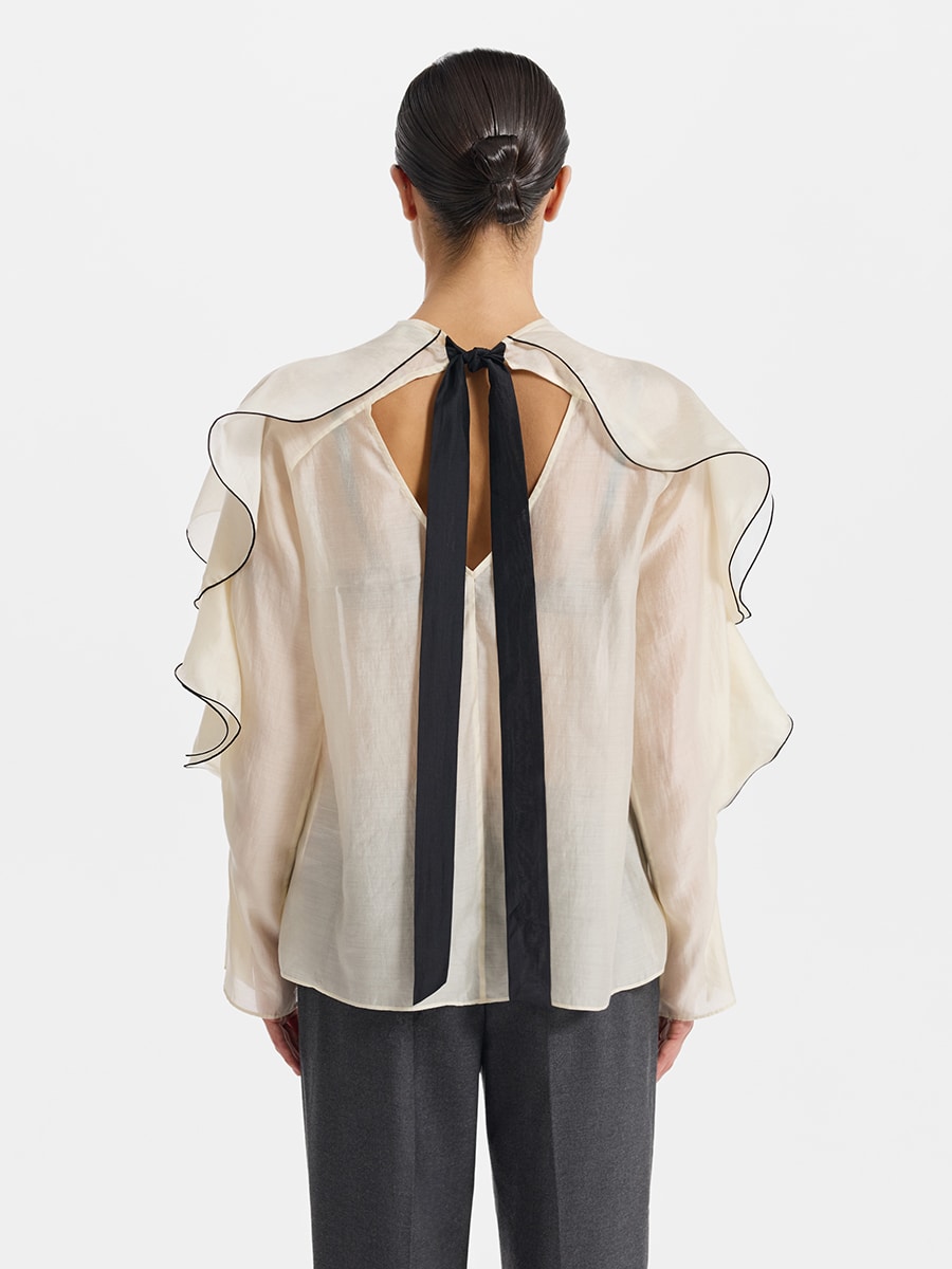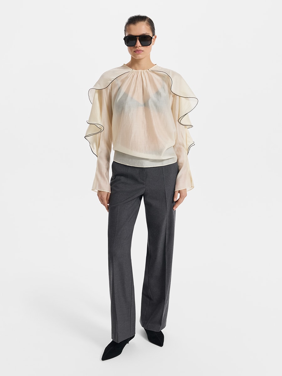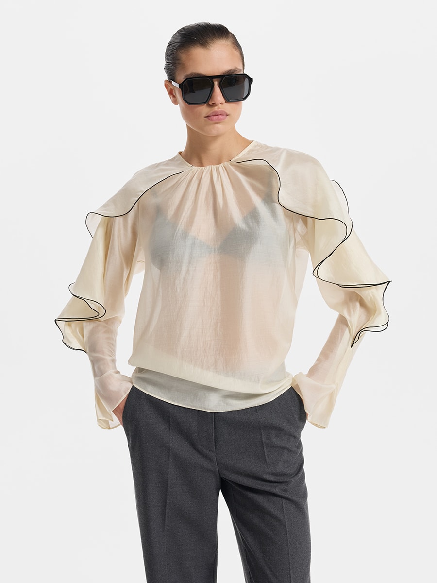 Для вечернего образа рекомендуем обратить внимание на блузки с рукавом три четверти и ярким декором. Это отличное решение, если сразу после работы тебе нужно попасть на вечеринку или торжественное мероприятие. Комбинируй модель с брюками, юбками или джинсами из денима темных оттенков.